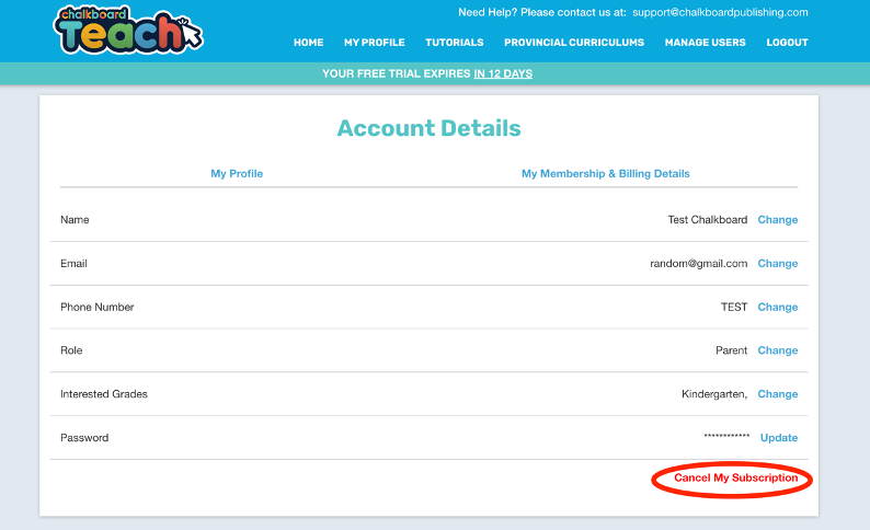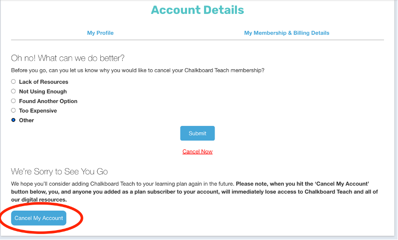 Note: once you cancel your account, you’ll lose full access to Chalkboard Teach meaning you will no longer be able to login and access any resources
